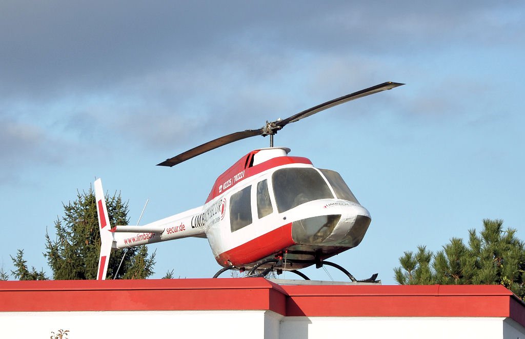 Ausgeschlachtete Bell 206 als Werbeträger auf dem Dach einer Sicherheitsfirma in Meckenheim - 04.12.2009