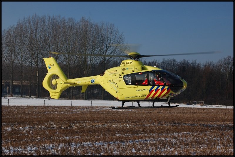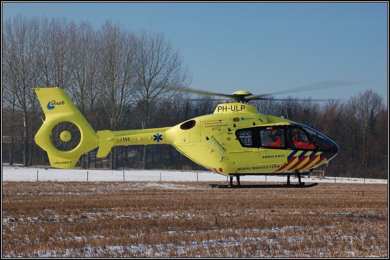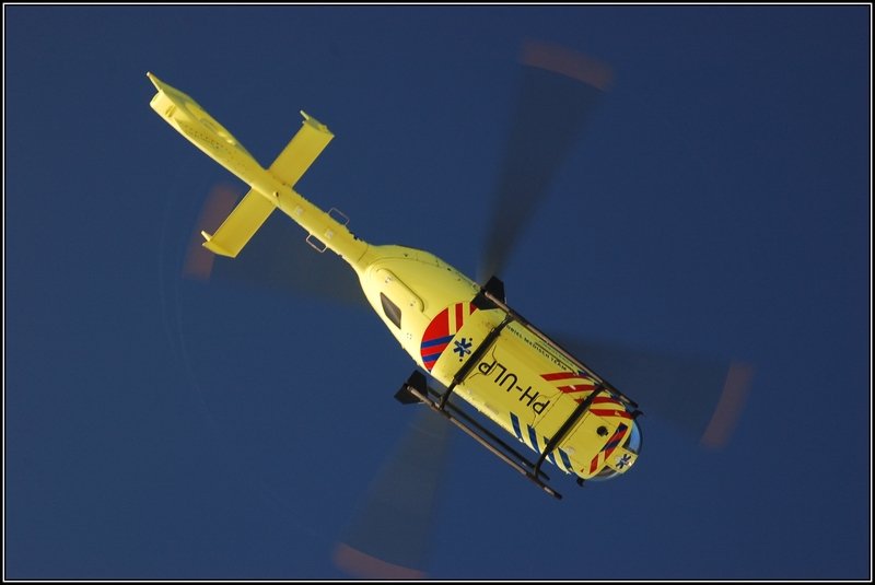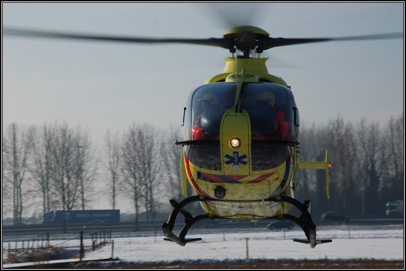 Da geht er endlich: Rettungshubschrauber 'Lifeliner 2' PH-ULP, nachdem die Bemannung geholfen hat bei einem Unfall. Ridderkerk, den 6. Januar 2010.