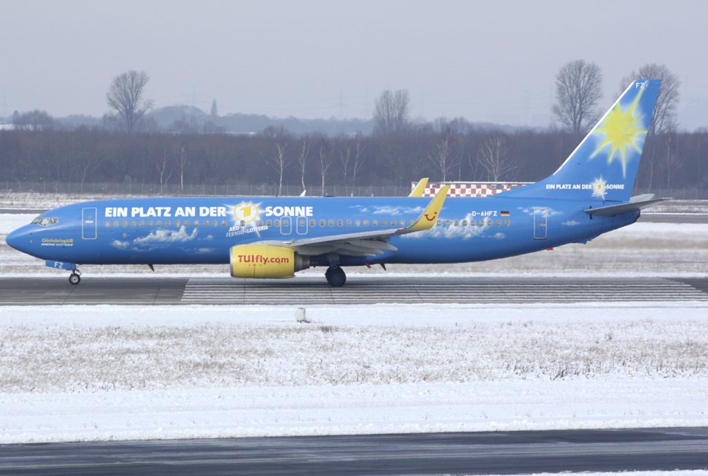 D-AHFZ (Boeing 737-8K5) "ARD Frensehlotterie" beim Start in DUS als X3 2114 in Richtung LPA. 06.01.2010.