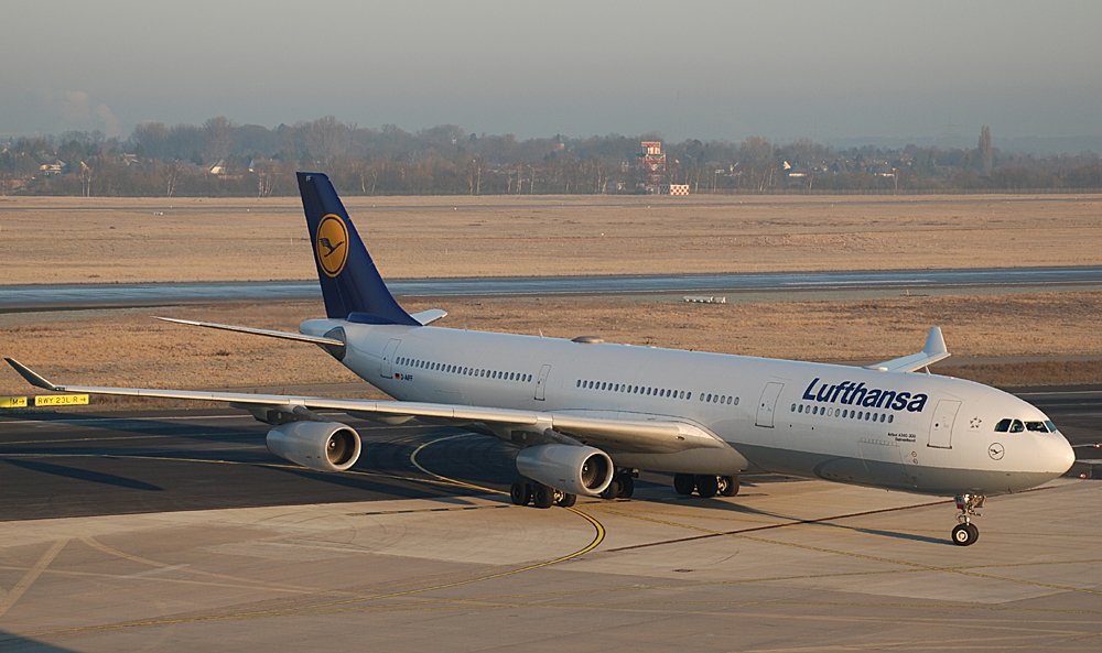 D-AIFF "Delmenhorst" (Airbus A340-313X) nach der Landung auf dem Flughafen Düsseldorf am 29.12.2008.