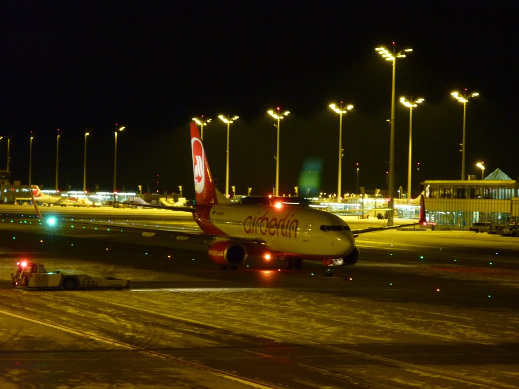 Eine Boeing 737, der Air Berlin, mit Registration D-ABLB, am Flughafen München bei Nacht.
