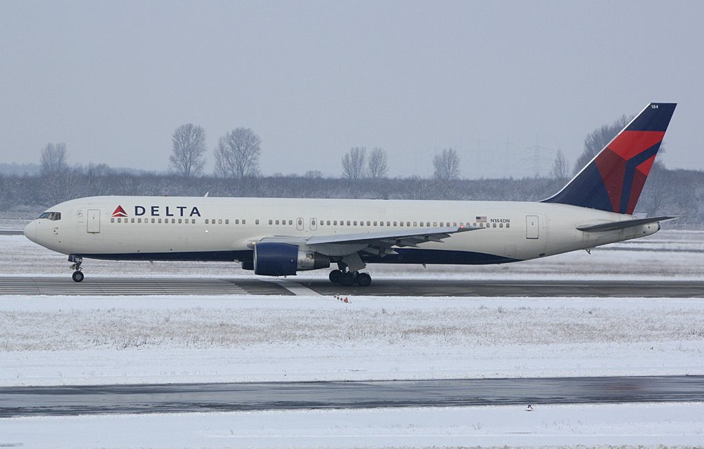 N184DN (Boeing 767-332/ER) der Delta Air Lines beim Start in DUS nach ATL. 04.01.2010.