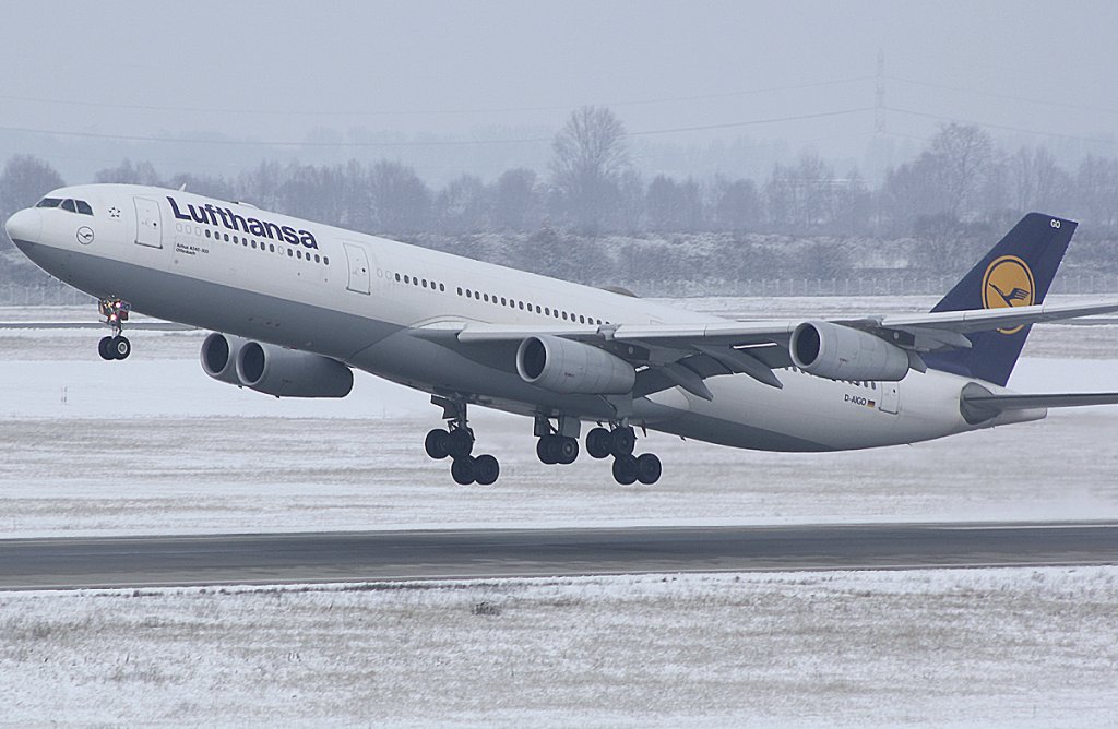 Nahaufnahme von D-AIGO (Airbus A340-313X) "Offenbach" beim Start in DUS. 04.01.2010.