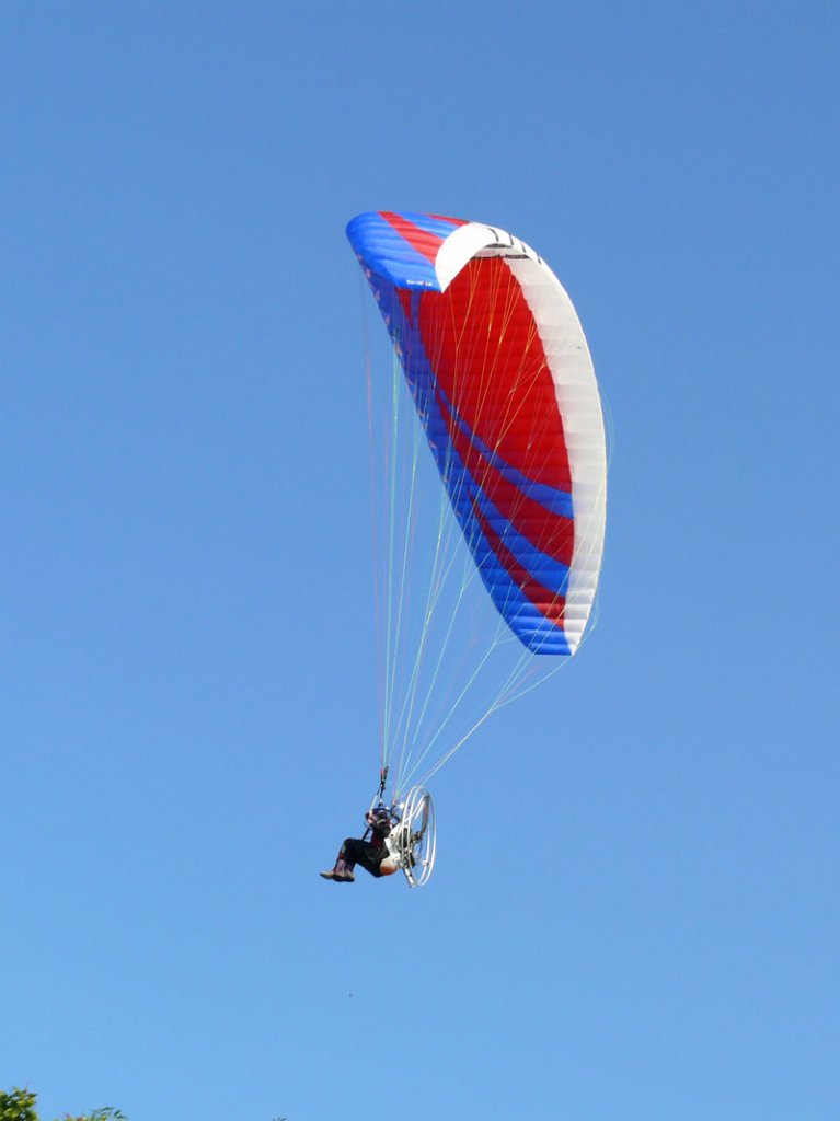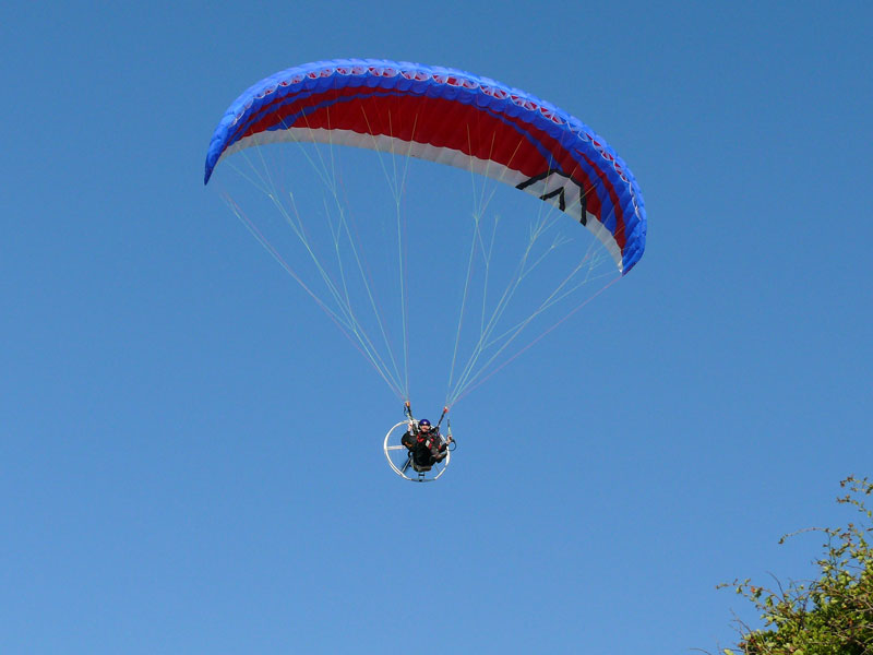Dieser Motorgleitschirmflieger kam über dem Strand an der Ostseeküste bei Brook (Mecklenburg) entlang; 07.07.2010
