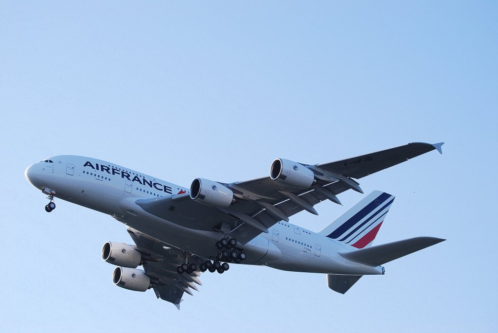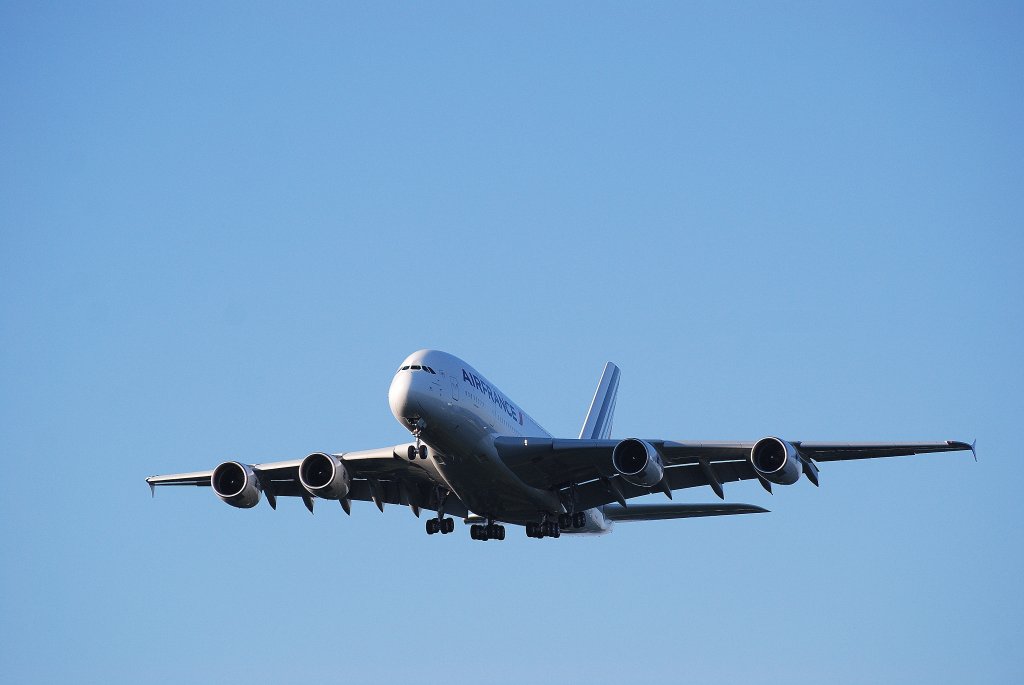 Airbus A380 der Air France im Landeanflug auf das Airbuswerk Hamburg Finkenwerder am 13.07.10
