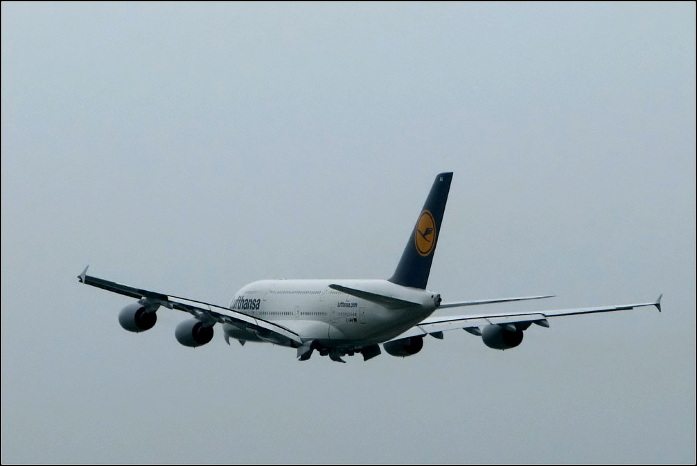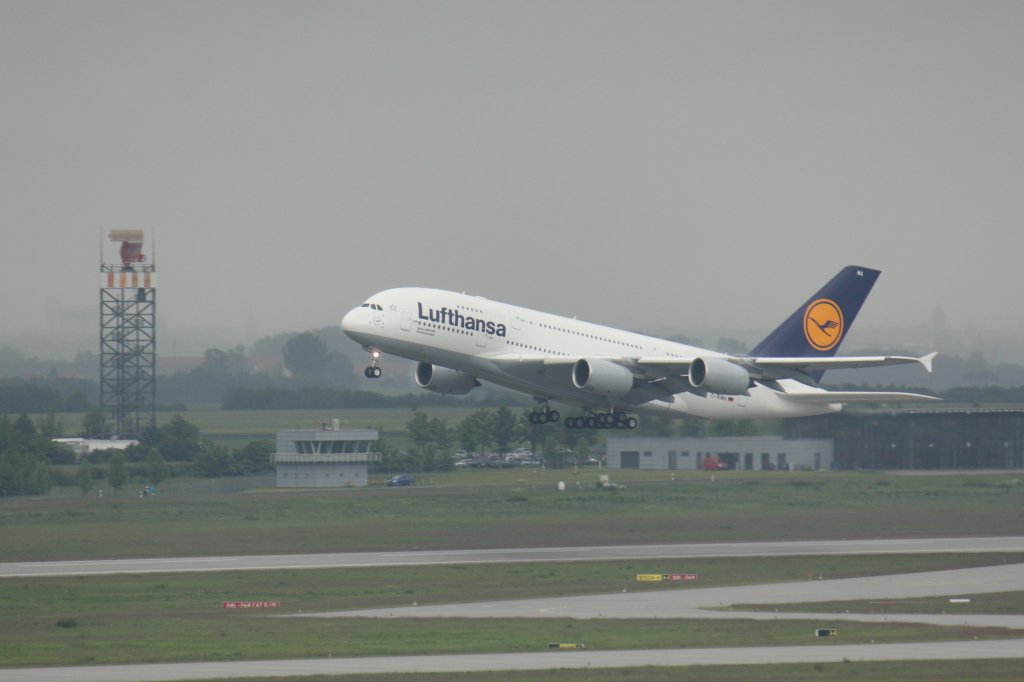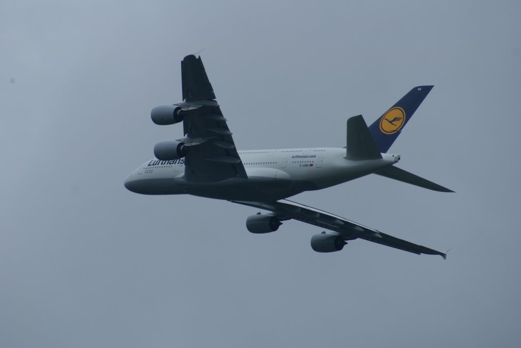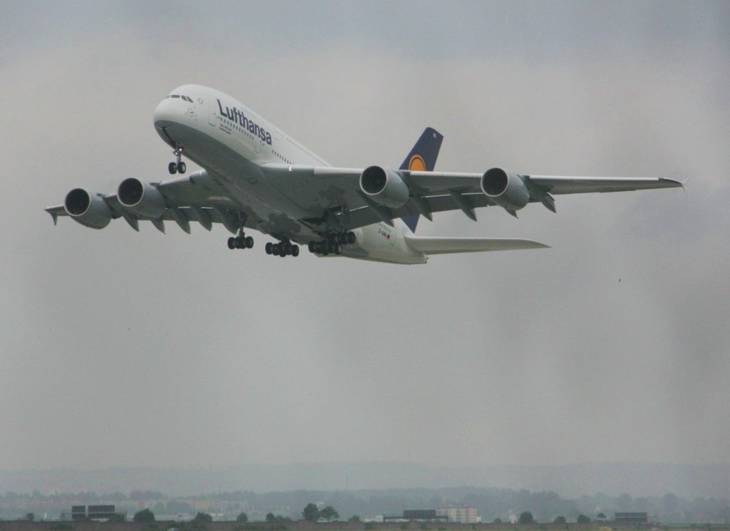 Lufthansa-Airbus A380-800 beim Start in Stuttgart am 02.06.10