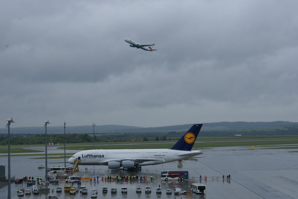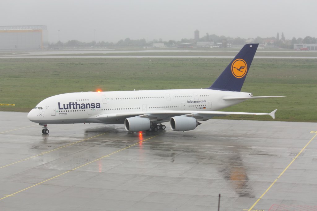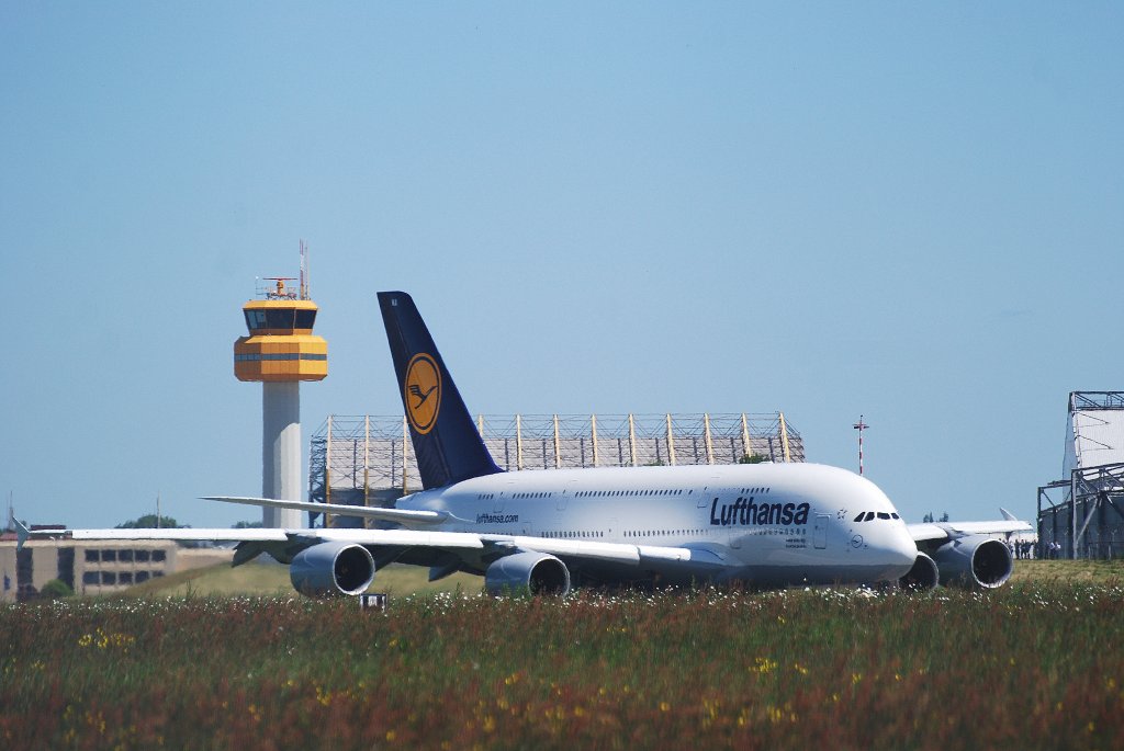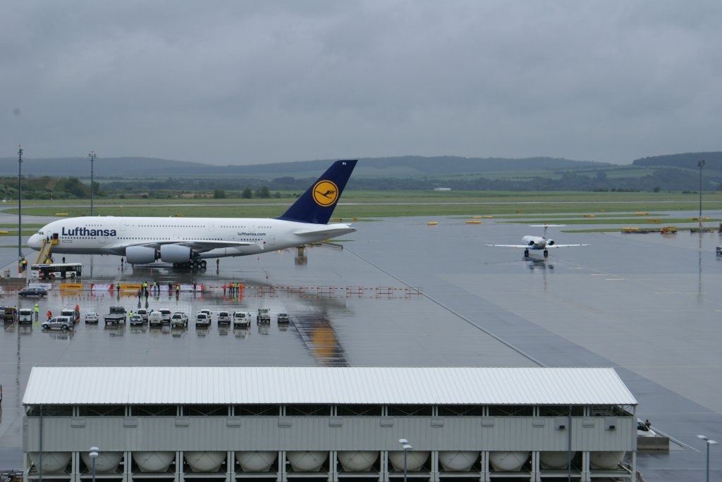 Großer Besuch heute (01.06.2010) am Flughafen Leipzig/Halle. Der erste Airbus A380 der Lufthansa war zu Trainingszwecken für einen Tag zu Gast. Zwischen den Trainingseinheiten parkte der Flieger auf dem Vorfeld.