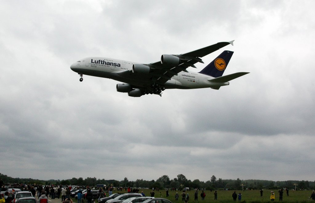 Airbus A380-800 der Lufthansa bei der Landung auf dem Baden-Airpark am 31.05.10