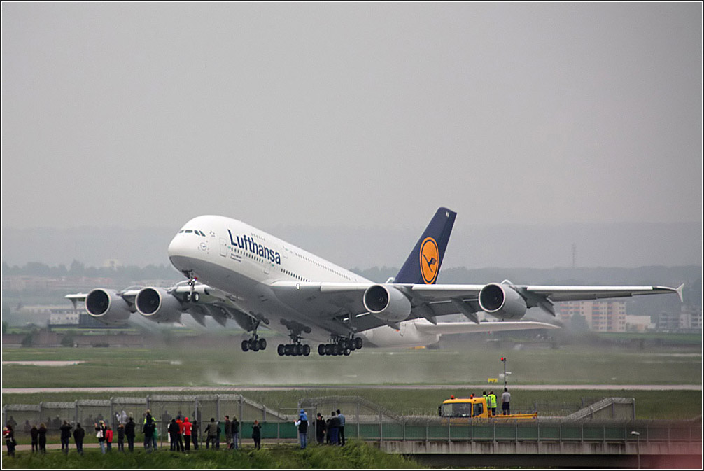 Nach der Pause ging es für den A380 von der Startbahn Süd wieder in den dunklen und verregneten Himmel über Leipzig. Fotografiert am 01.06.2010. Einen Gruß noch an den Fotokollegen, der extra für dieses Event aus München angereist ist ;-)