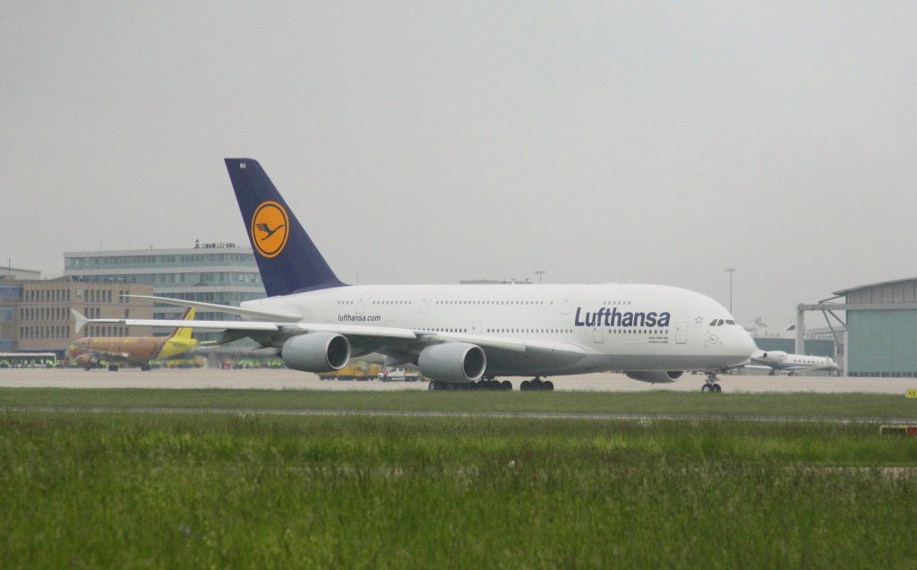 Der Airbus A380-800 der Lufthansa beim Rollen zur Startbahn in Stuttgart am 02.06.10