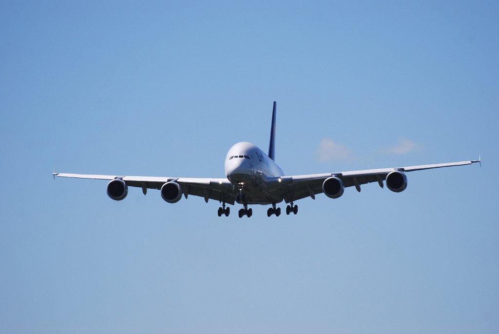 Am 2. Juni 2010 landete zum ersten mal die A380 auf dem Flughafen Stuttgart. Hier das Flugzeug kurz vor dem Aufsetzen. (Matthias)