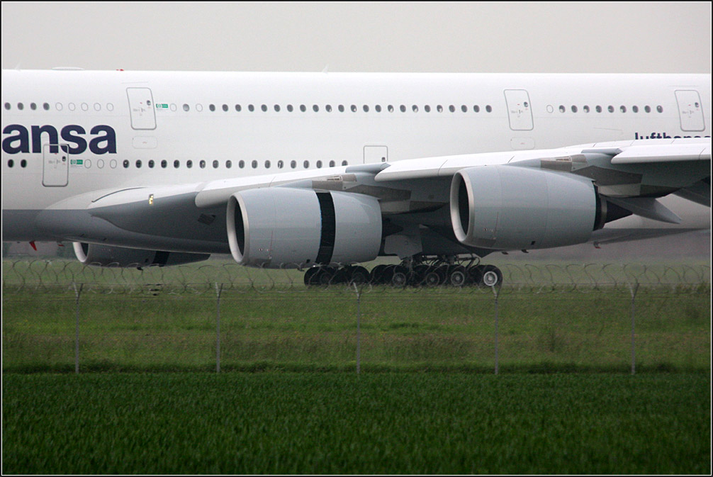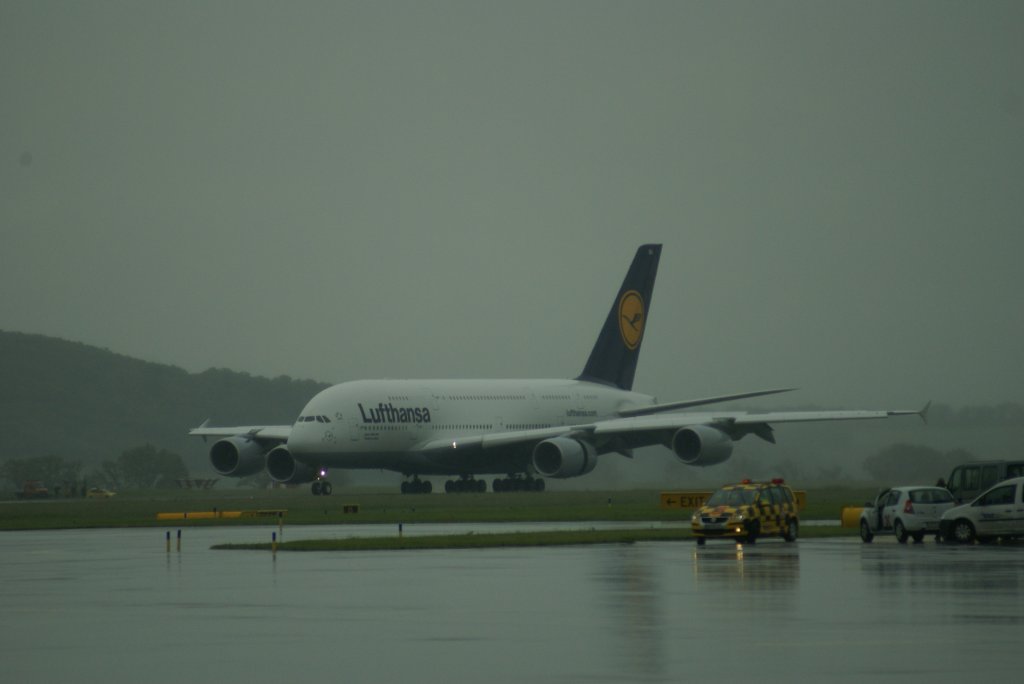 Landeanflug des Airbus A380-800 "Frankfurt am Main" auf den Flughafen Linz am 02. Juni 2010 bei strömendem Regen.