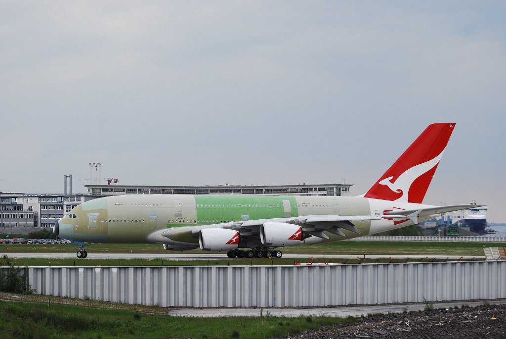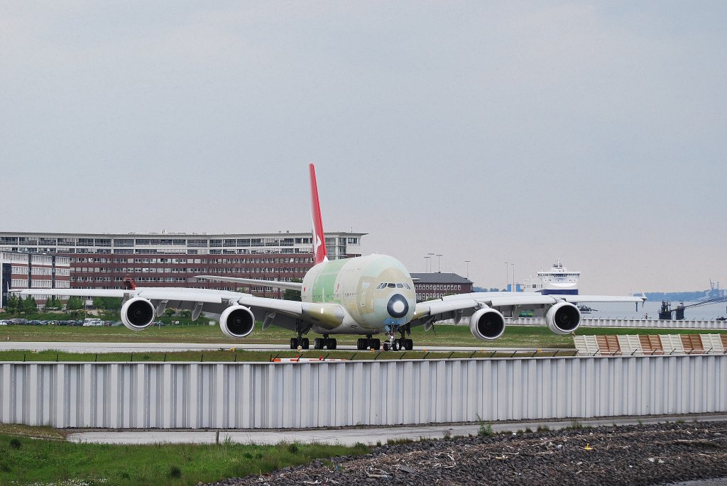 Dieser noch unlackierte Airbus A380 von Qantas ist soeben in Hamburg Finkenwerder gelandet aufgenommen am 27.05.10
