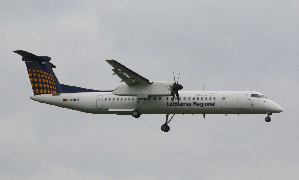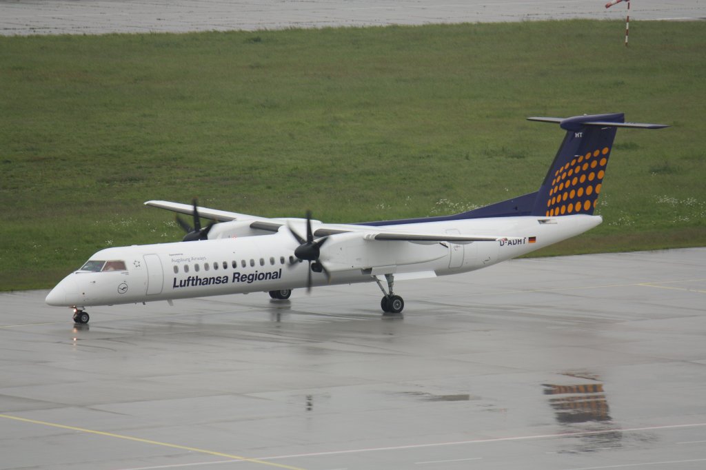 Eine Bombardier Dash 8 Q400 mit der Kennung D-ADHT der Augsburg Airways/Lufthansa Regional auf dem Vorfeld des Flughafens Leipzig/Halle. Fotografiert am 01.06.2010.
