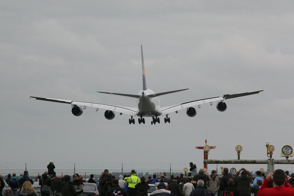 Noch wenige Sekunden bis zur ersten Landung eines A380 am Blue Danube Airport Linz am 02. Juni 2010. Trotz des schlechten Wetters waren zahlreiche Menschen auf den Beinen, um bei diesem - wahrscheinlich einmaligen - Ereignis dabei gewesen zu sein.