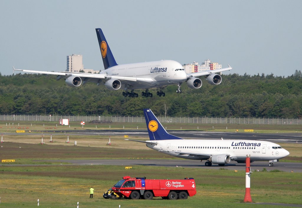 Lufthansa A 380-841 D-AIMA"Frankfurt a. Main" kurz vor der Landung am 03.06.2010 in Berlin-Tegel. Lufthansa B 737-330 D-ABES "Köthen/Anhalt" im Größenvergleich dazu.