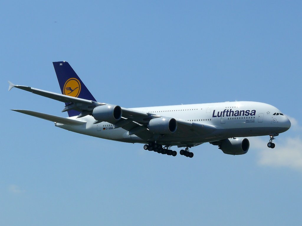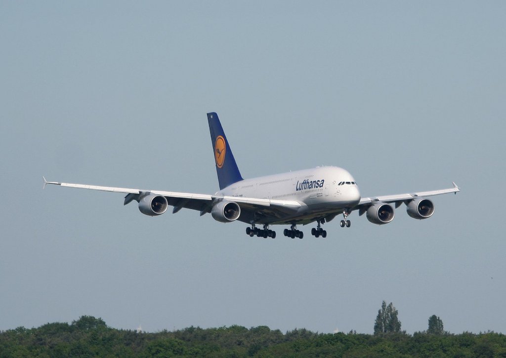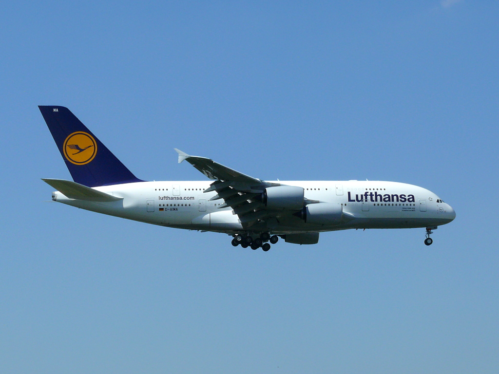 Der erste Lufthansa Airbus A380-800 D-AIMA Frankfurt am Main im Landeanflug auf Hamburg Fuhlsbüttel am 03.06.10