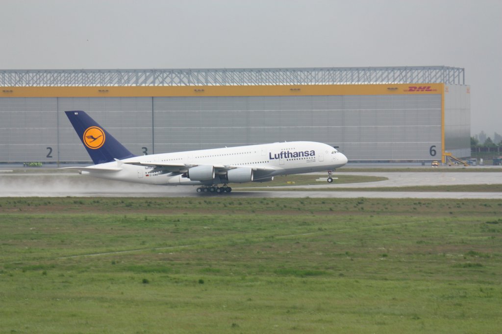 Der A380 der Lufthansa (D-AIMA) kurz nach dem Durchstarten auf der Startbahn Nord auf dem Flughafen Leipzig/Halle. Fotografiert am 01.06.2010.