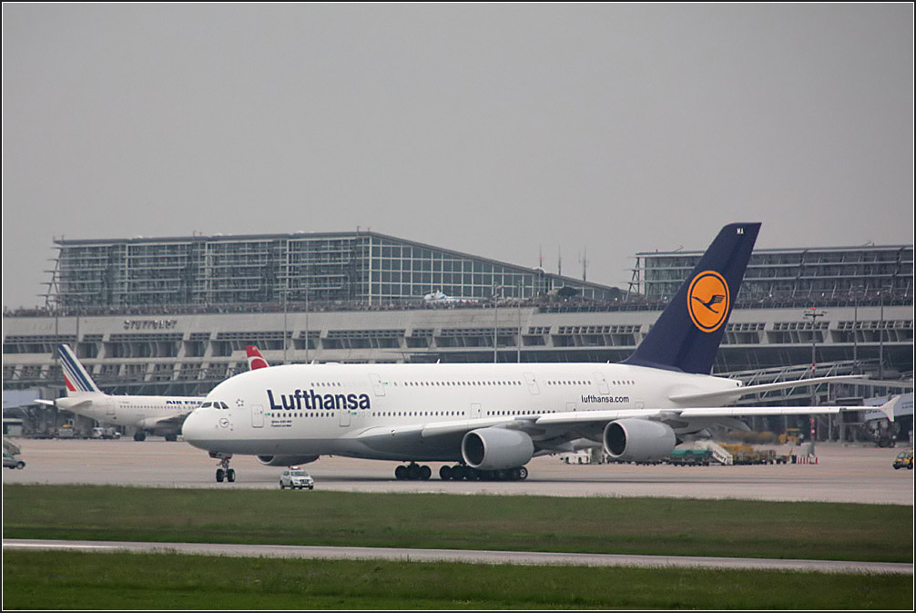 Airbus A380-800 D-AIMA "Frankfurt am Main" der Lufthansa steht auf seinen Flugplatz während eine Fokker F100 der Austrian Airliner gerade gestartet ist.