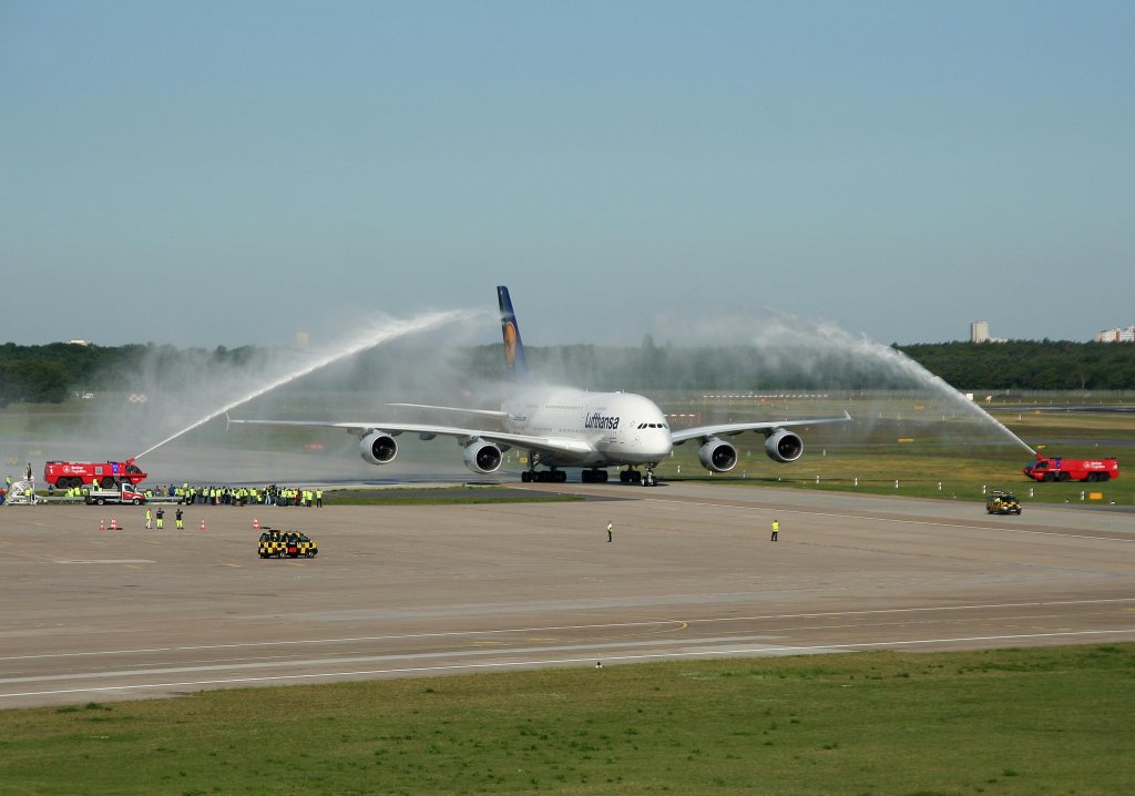 Tolle Begrüßung für den Lufthansa Airbus A 380-841 D-AIMA "Frankfurt a. Main" am 03.06.2010 in Berlin-Tegel