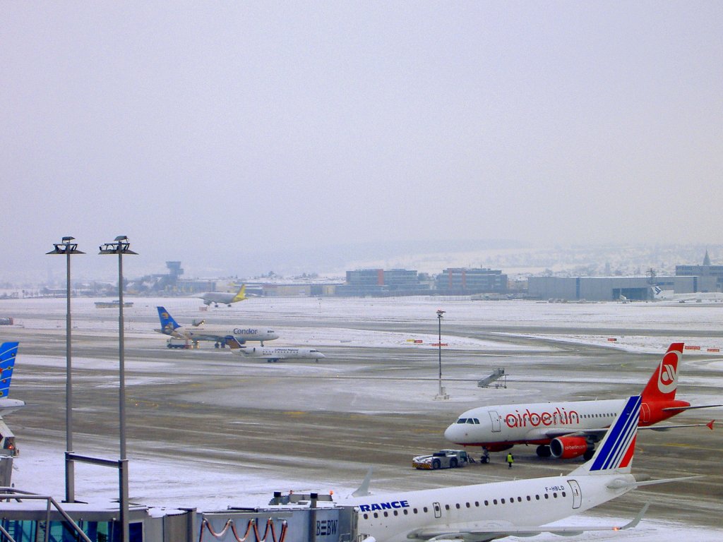 Ganz vorne am Terminal steht eine Air France (Regional)-Embraer ERJ-190-100LR. Weiter hinten ist ein Airberlin-Airbus A319-100 zu sehen und im weiteren Hintergrund rollt eine Canadair CRJ-100 von Eurowings zur Startbahn und hintendran wird gerade ein Condor-Airbus A320-200 enteist und dahinter landet gerade ein Germanwings-Airbus A319-100.
