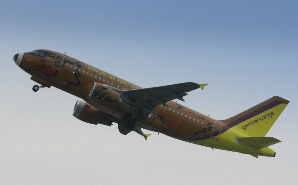 Der Germanwings-Airbus A319-100 mit der Zulassung D-AKNO steigt am 02.06.10 vom Stuttgarter Flughafen zu den Wolken.