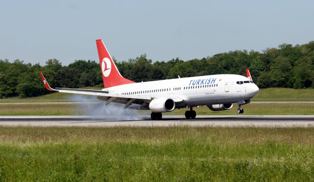 Eine Boeing B 737-8F2 der Turkish Airlines mit der Kennung TC-JFP (Taufname Amasya) aufgenommen am 05.06.2010 auf dem Flughafen Basel-Mülhausen-Freiburg (BSL)