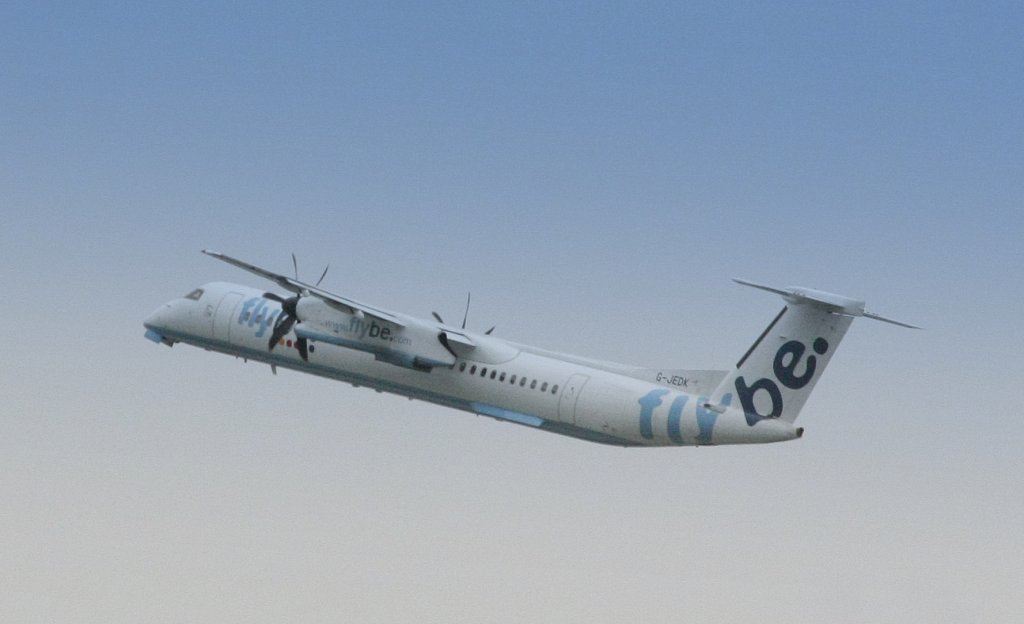 Eine Dash-4 von flybe steigt zu den Wolken (02.06.10; Stuttgart Airport)