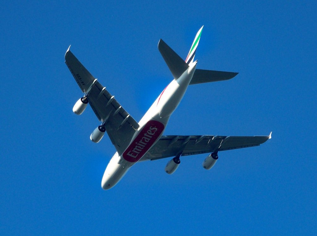 Emirates, A380-842, A6-EDK auf dem Weg zum Flughafen Finkenewerder auf ungefähr 4000 Fuß. Aufgenommen am 21.2.10.