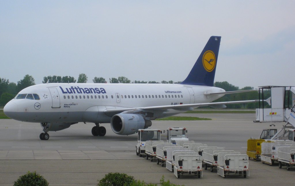 Lufthansa-Airbus A319-100 kurz vor dem Flug nach Frankfurt auf dem Baden-Airpark-Vorfeld am 08.05.10