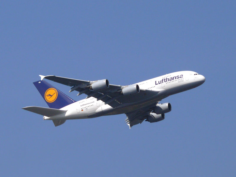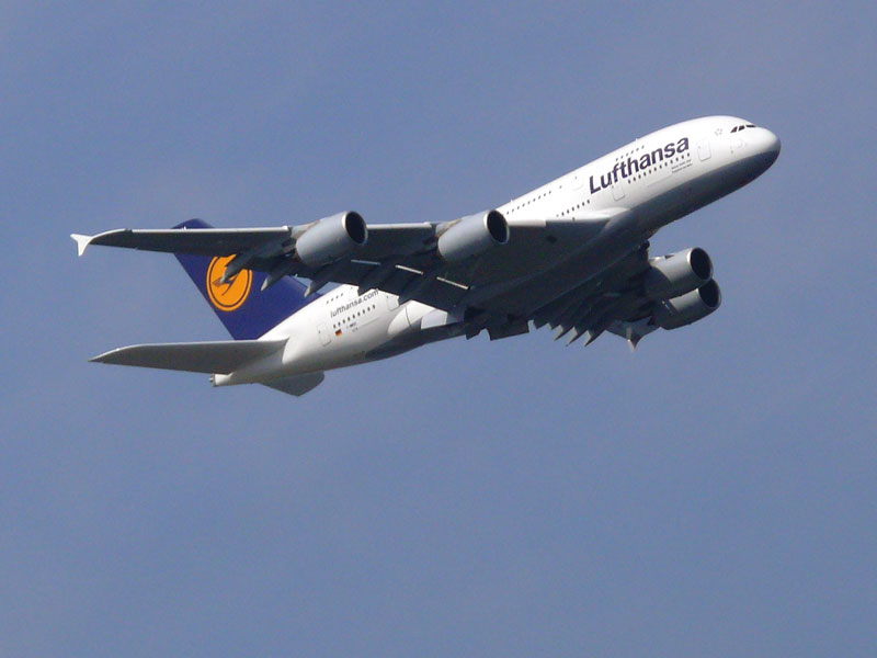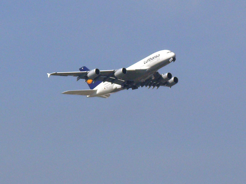 Lufthansa-Aibus A380 D-AIMA nach dem Start in Finkenwerder (2), (von einer Elb-Fähre geschossen); Hamburg, 24.04.2010