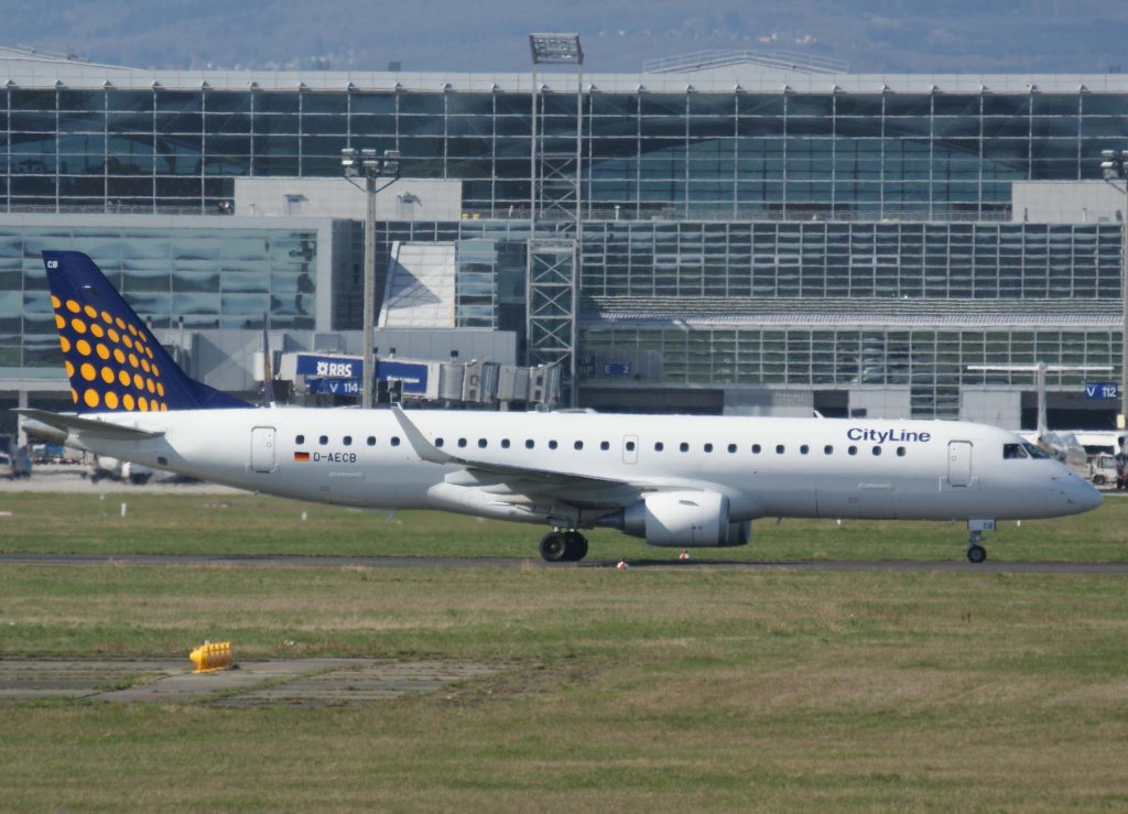 Eine Lufthansa CityLine Embraer ERJ-190 rollt zur Parkposition in Stuttgart am 24.04.10