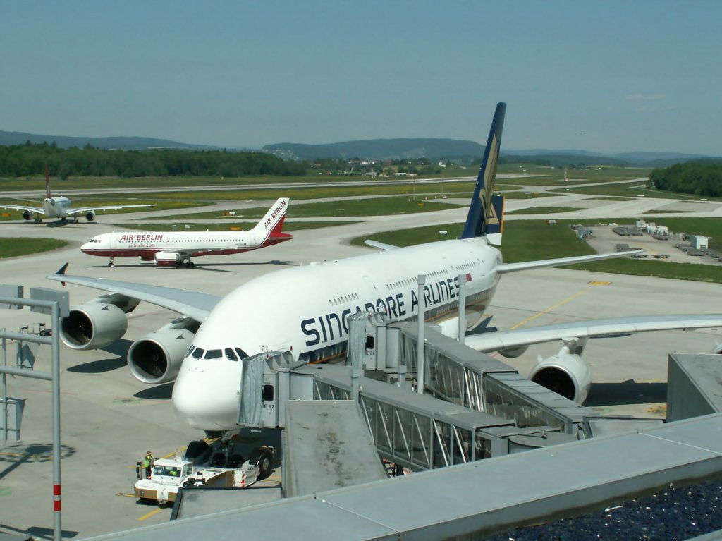 Airbus A-380 der Singapore Airlines am 25.05.10 am Flughafen Zürich-Kloten,Standplatz E67