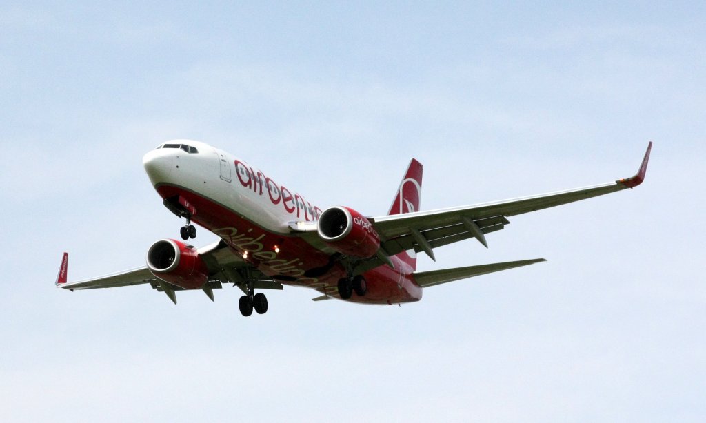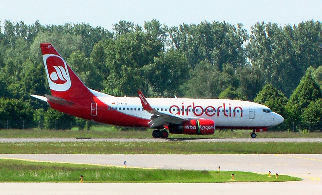 Die Air Berlin-Boeing 737-700 mit der Zulassung D-ABLB schwebt langsam auf dem Flughafen Karlsruhe/Baden-Baden ein.