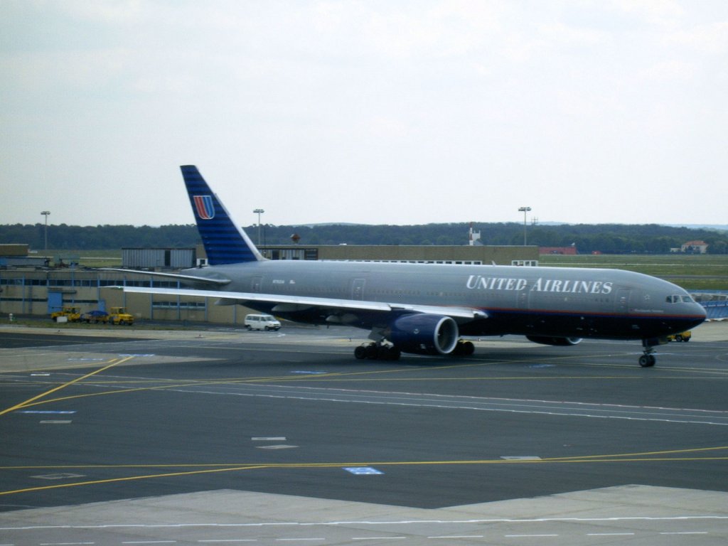 Diese Boeing 777-200ER der United Airlines rollt am 27. Mai 2004 in Frankfurt am Main zur Startbahn.