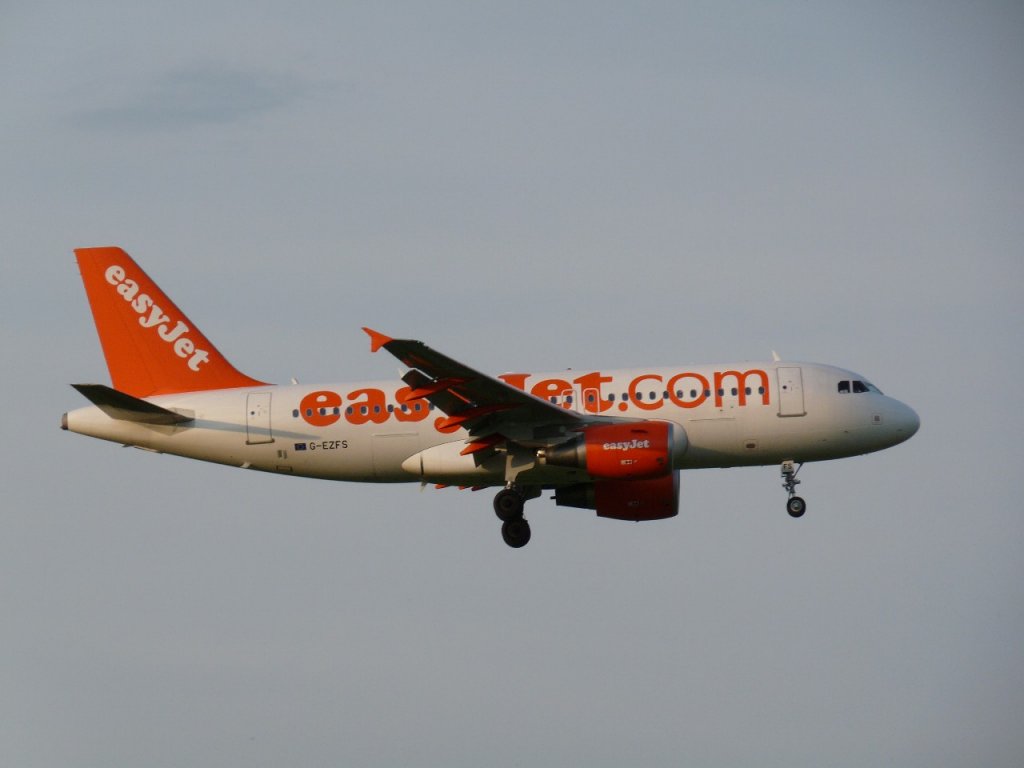 easyJet Airbus A319-111 kurz vor Sonnenuntergang im Landeanflug auf Piste 14 in Zürich am 25.5.10.