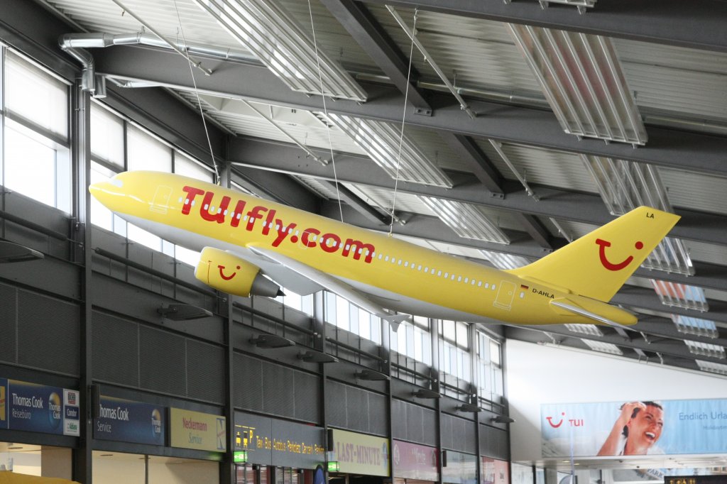 Großmodell eines Airbus A310-300 der TUIfly an der Decke des Baden-Airpark-Terminals