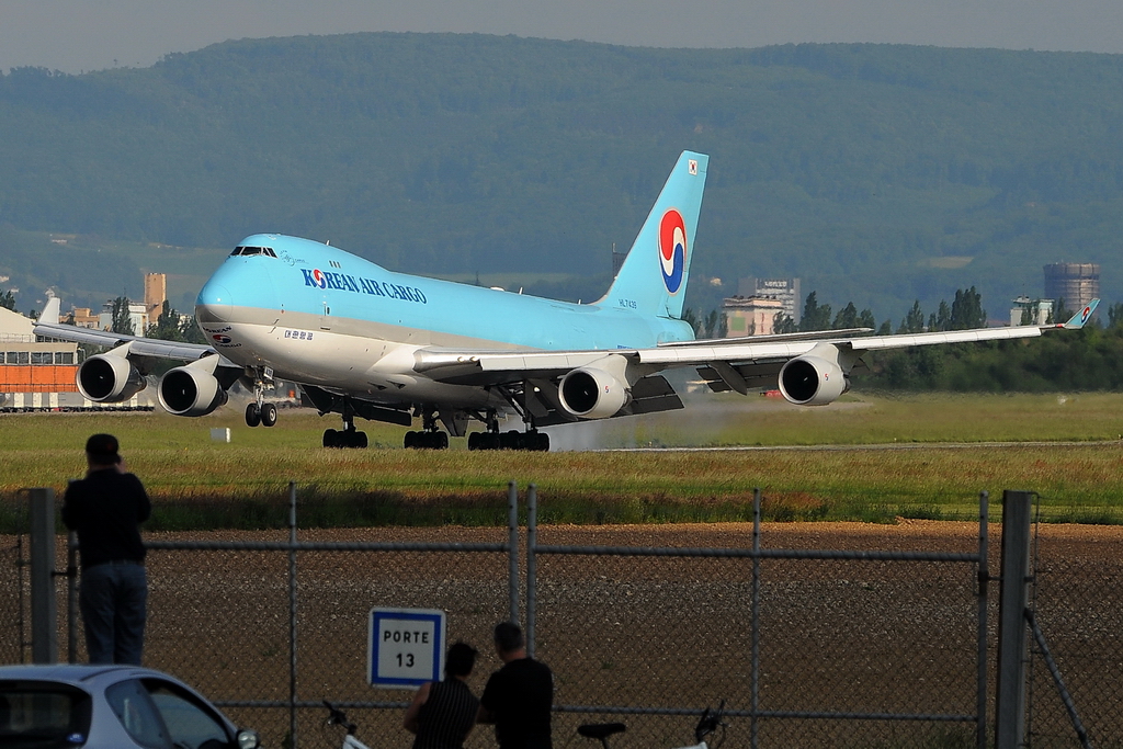 Korean Air Cargo, HL7439, Boeing 747-4B5F/ER/SCD. Der Jumbo landet im späten Nachmittagslicht am EuroAirport auf der Bahn 34. Spotter mit Leitern sind natürlich auch immer mit dabei. Sonntag, 23.5.2010.