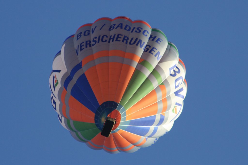 Ein Heißluftballon mit BGV-Werbung (Badisch Gut Versichert) fliegt dicht über mir (28.08.10)