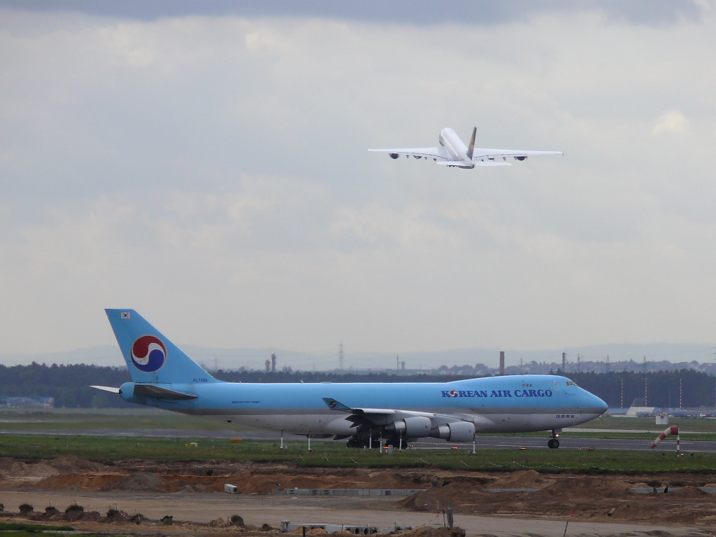 Korean Air Cargo; HL-7466, Boeing 747-4B5F + Lufthansa "München " Airbus A380-841. Flughafen Frankfurt/Main. 25.09.2010.