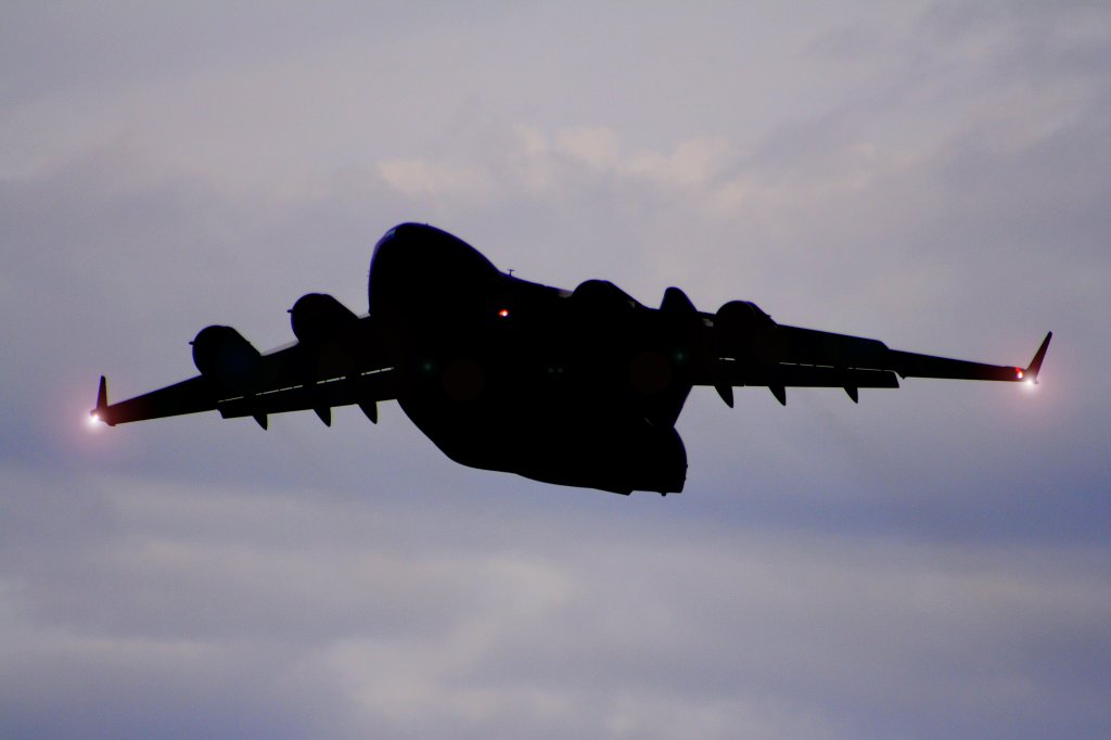 Startende USA - Air Force-Boeing C-17 Globemaster III in den Nachthimmel vom Baden-Airpark am 25.08.2010