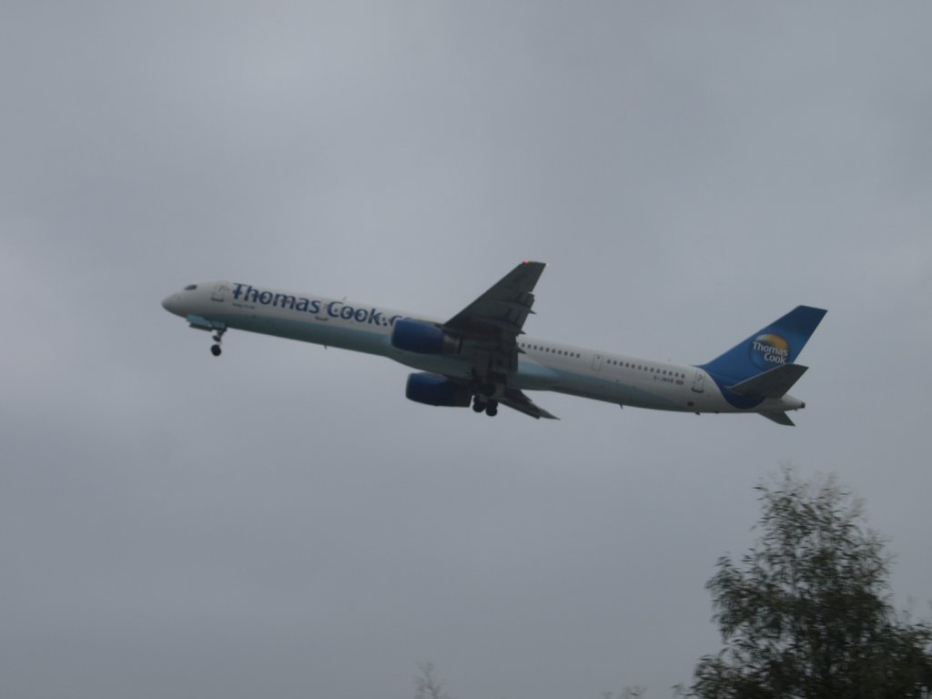 Eine Boeing 737 der britischen Thomas Cook beim Start im Regen von Korfu.