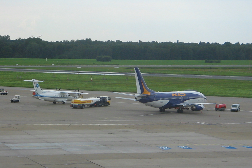 Eine Cirrus Airlines-Dornier Do 328 und eine KD Avia-Boeing 737 stehen auf dem Flughafenvorfeld in Hamburg-Fuhlsbüttel (11.08.2008)