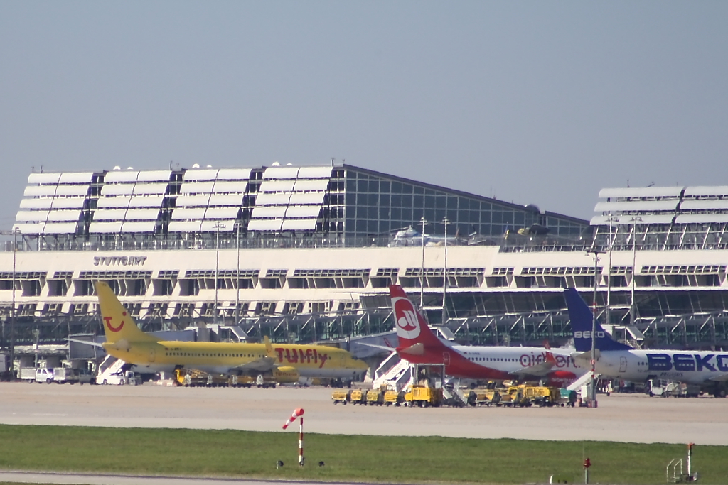 Blick von einem der beliebesten Spotting-Points des Stuttgart Airport, vom kleinen Parkplatz des Real-Marktes auf die Runway mit startender Air Berlin-Boeing 737-700 (10.10.10)
