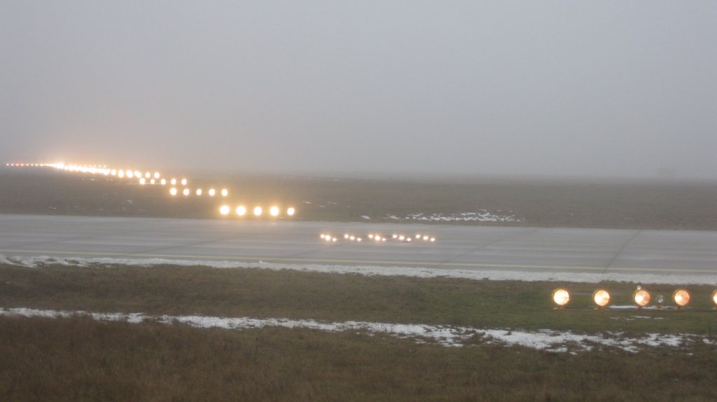 Erleuchtete Landebahn 25R im Nebel in Frankfurt (06.02.10)