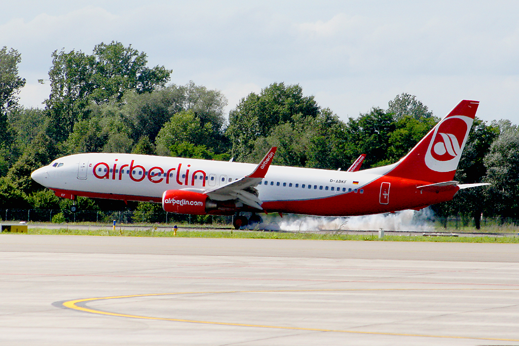 Air Berlin-Boeing 737-800 D-ABKF beim Touch-down auf dem Baden-Airpark am 26.08.10