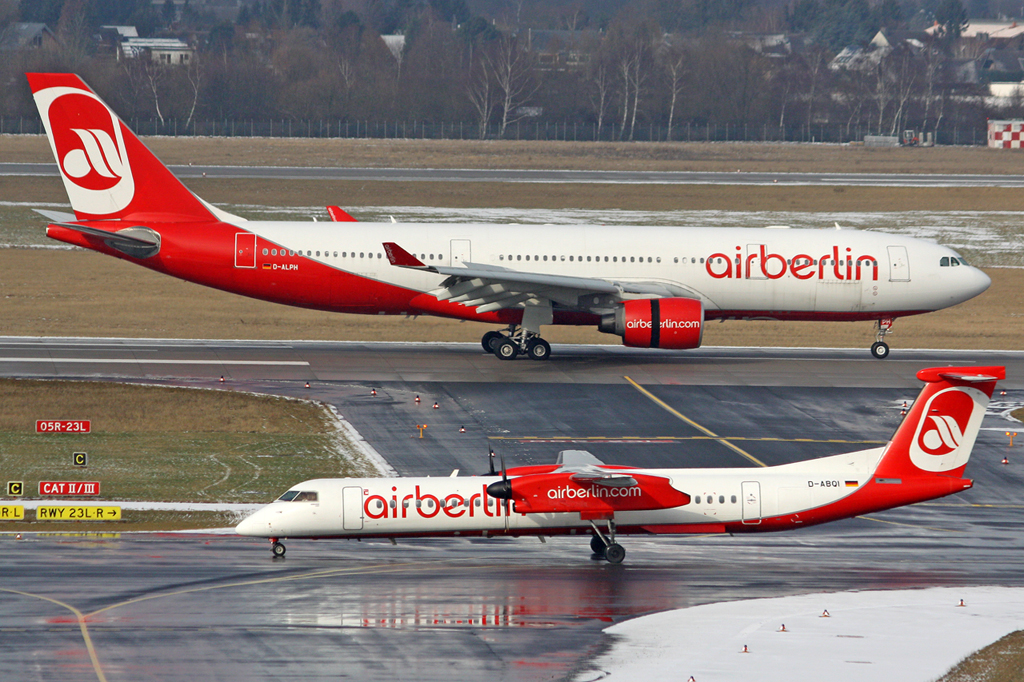 Air Berlin (LGW) De Havilland Canada DHC-8-402Q D-ABQI und Air Berlin Airbus A330-223 D-ALPH in Düsseldorf am 13,02,10