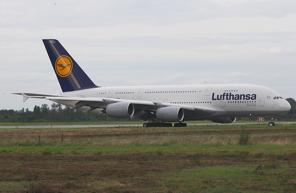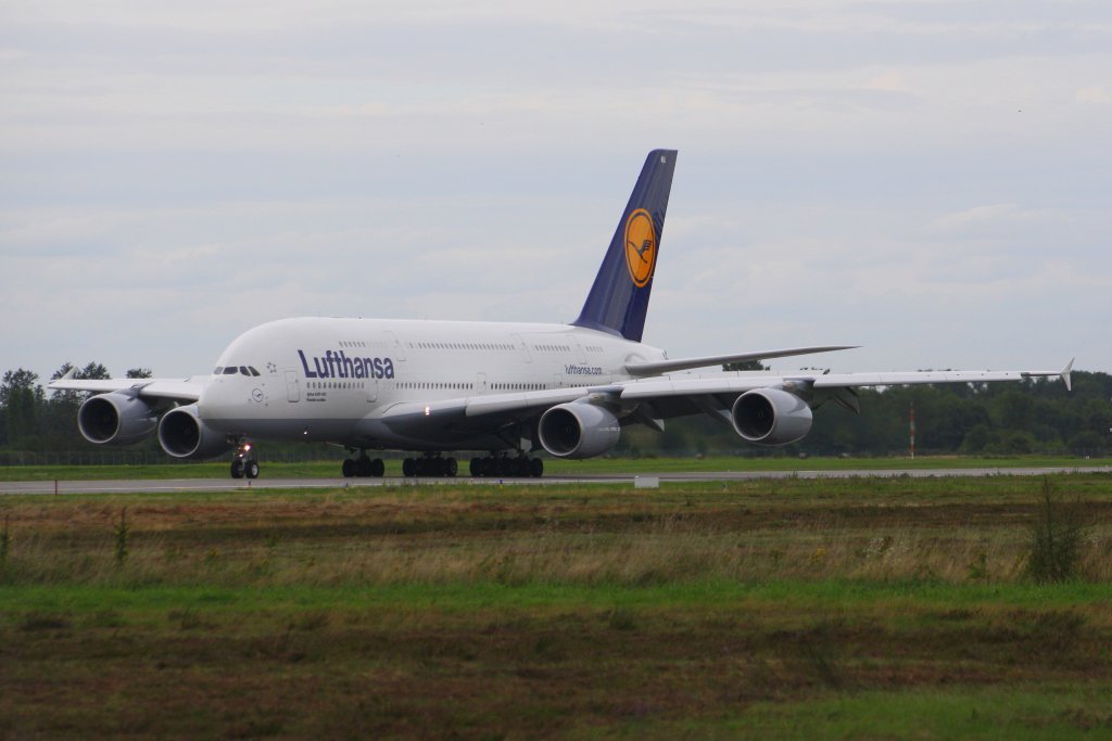 Der neue Lufthansa-Airbus A380-800 D-AIMA beim Ausrollen von der Runway am Baden-Airpark am 25.08.10