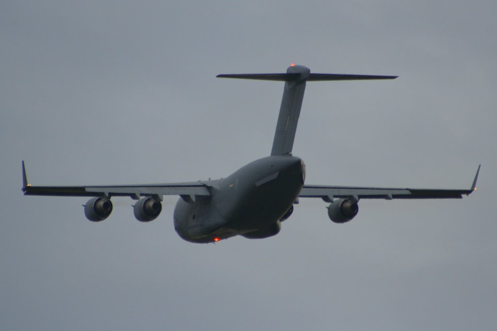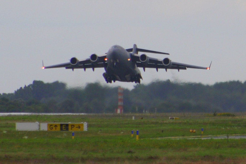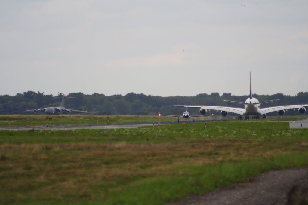 Der Lufthansa-A380 rollt ans Terminal auf dem Baden-Airpark, hintendran wartet die US Air Force-Boeing CC-177 Globemaster III auf die Startfreigabe (25.08.10)
