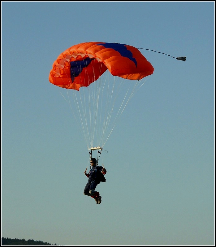 Der aus dem Ballonkorb abgesprungene Gleitschirmflieger kurz vor der Landung auf dem Flugplatz Trier Föhren am 21.08.2010, während der Mosel Ballon Fiesta.